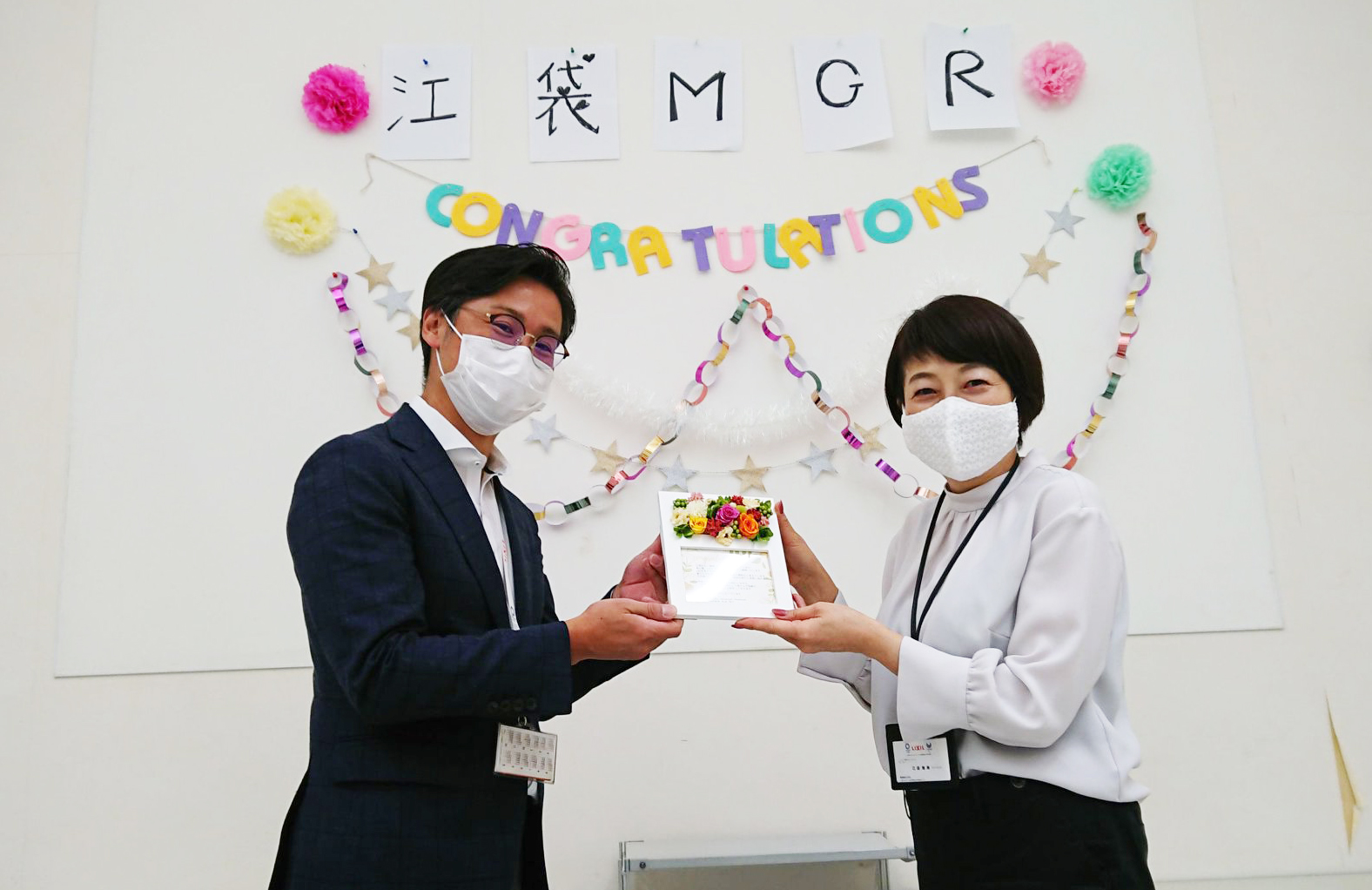 従来は社内で永年勤続者をアナウンスするシンプルなものでしたが、今年からショールームごとにセレモニーを開催する形式へと変更しました。対象者が在籍しているショールームに独自でセレモニーを計画してもらう形を取り、当日はスペースを華やかに飾りつけ、仲間が見守る中でセレモニーが実施されました。中にはサプライズで準備を進め、対象者を驚かせたショールームもあったようです。社員用SNSにも当日の様子がアップされ、アットホームなショールームの様子や、暖かく仲間を祝福する様子が全国に向けて伝えられました。新しい形の取り組みとなった永年勤続セレモニーは、今後もショールームが一つになって取り組める形式を模索しながら、ブラッシュアップしていく予定です。