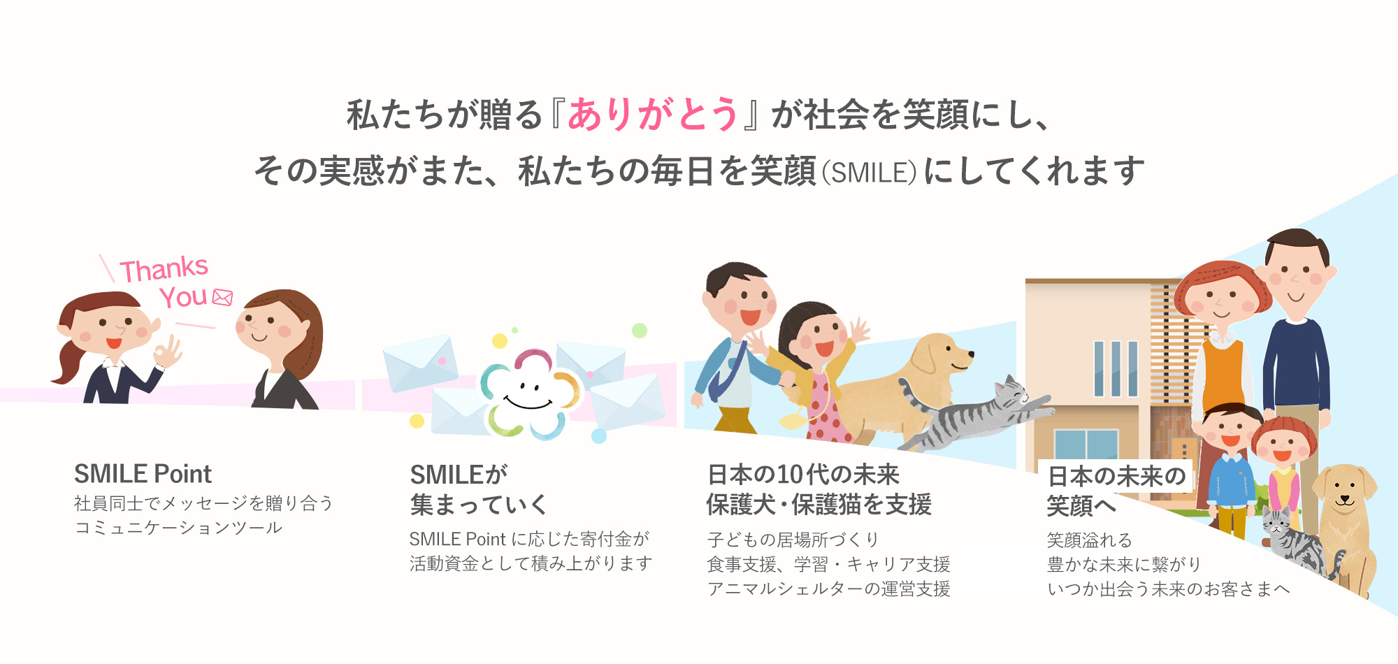 新しい寄付先である「カタリバ」への支援、そして継続する「保護犬・保護猫支援」。私たちの「ありがとう」の気持ちを多方面へ広げ、社内、そして社会にたくさんのSMILEを咲かせていきましょう!